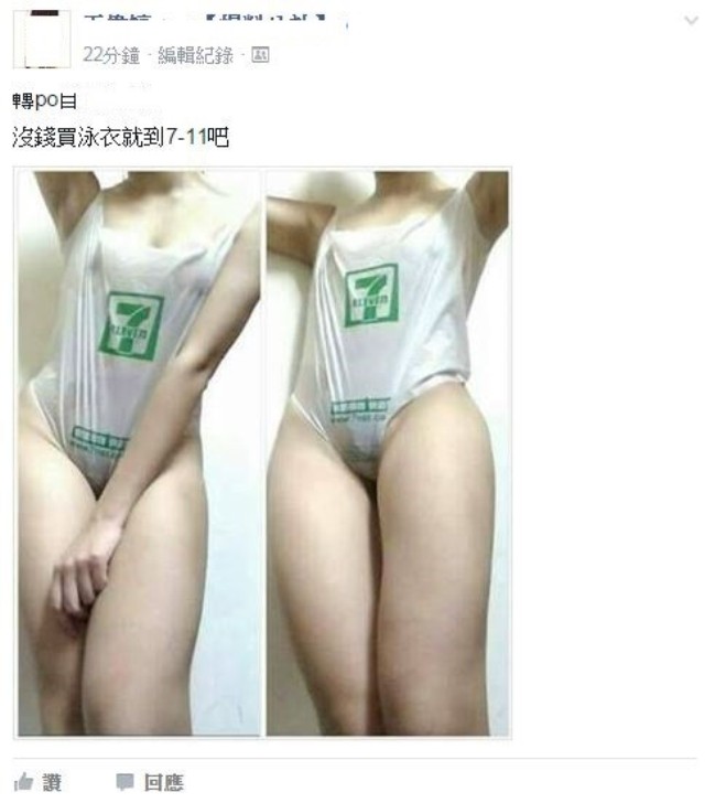 Esta curiosa propuesta se dio a conocer el pasado 25 de agosto, día en que el diario taiwanés Liberty Times replicó imágenes publicadas en un grupo de Facebook en las que una joven posaba en una fotografía vistiendo sólo una bolsa plástica de la popular tienda de conveniencia 7 eleven junto al texto "No hay dinero para comprar un traje de baño, así que vamos al 7 eleven".