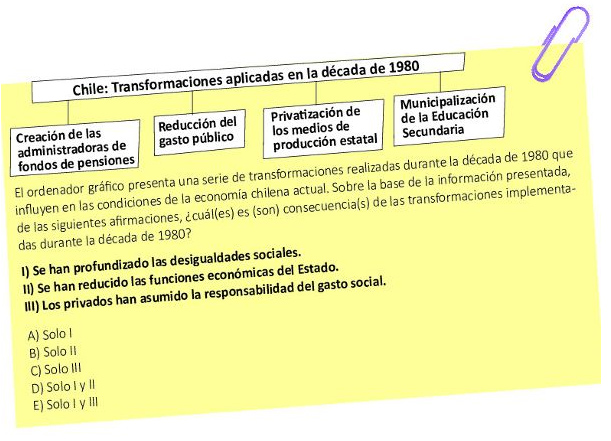 Entre las alternativas se postula que con estas "se han profundizado las desigualdades sociales", "se han reducido las funciones económicas del Estado" y que "los privados han asumido la responsabilidad del gasto social". La respuesta correcta apunta a las dos primeras opciones.