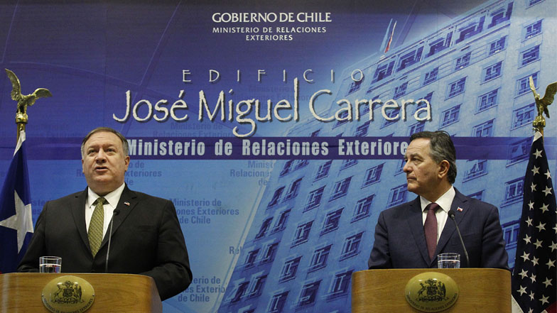 Tras reunirse con el ministro de Relaciones Exteriores chileno, Roberto Ampuero, en una conferencia conjunta Pompeo agradeció "a Chile por ser un líder para el pueblo venezolano, Estados Unidos les agradece que ustedes estén presidiendo a casi 290 mil venezolanos, muchos llegados aquí como refugiados".
