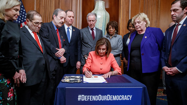 "Hoy hacemos historia", dijo la presidenta de la Cámara de Representantes, la demócrata Nancy Pelosi, poco antes de firmar el documento con los cargos contra Trump que luego recorrieron el Capitolio, en una solemne procesión, hasta llegar al hemiciclo del Senado.