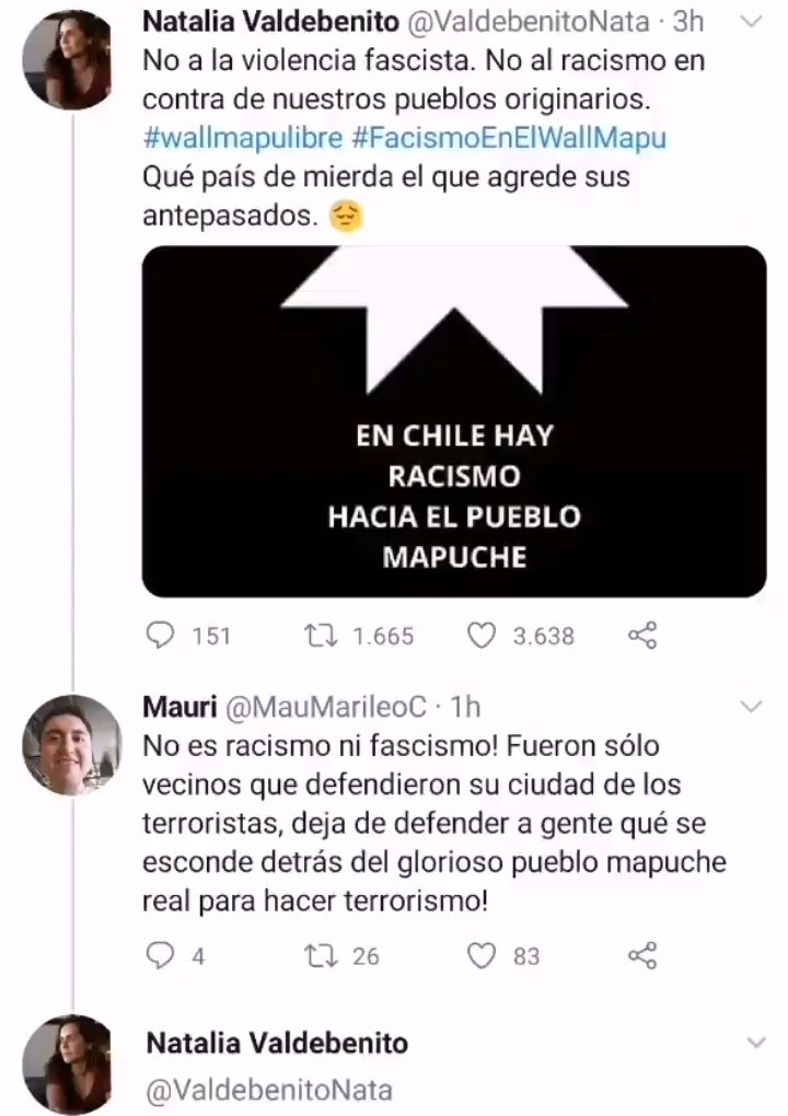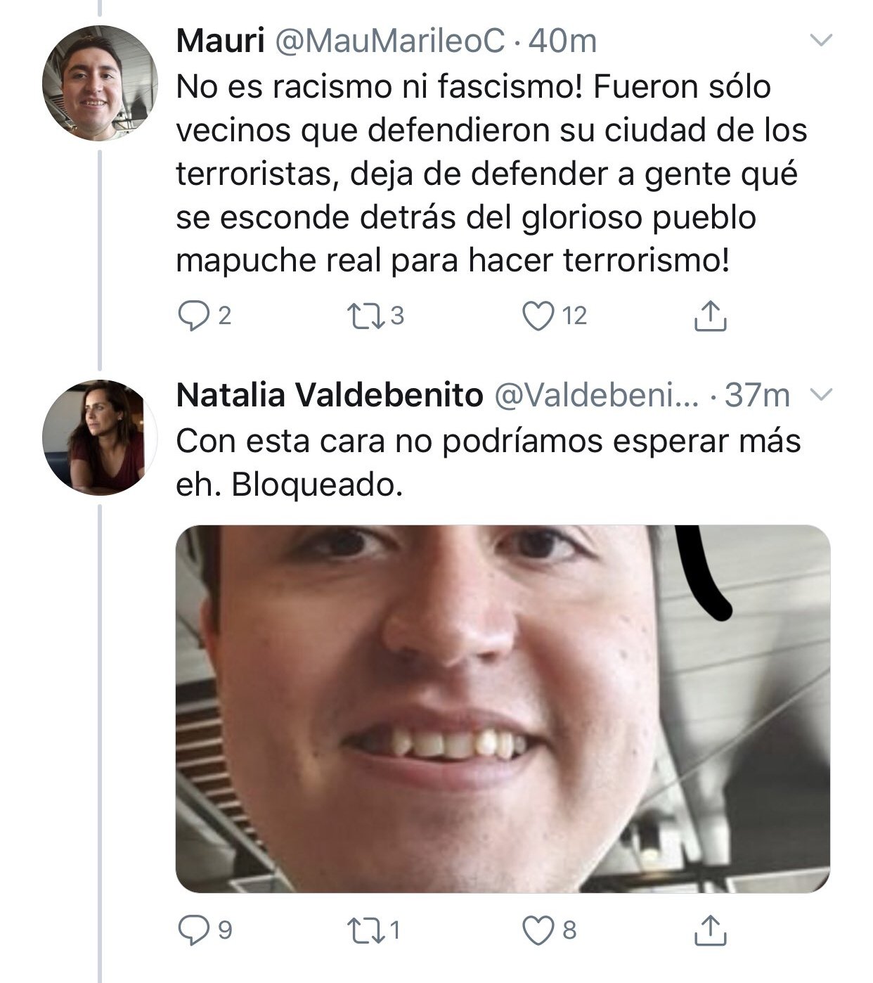 Todo surgió a raíz de que la artista publicó un mensaje en apoyo del pueblo mapuche, al cual el usuario @MauMarileoC le respondiera que ,lo ocurrido la madrugada del domingo en comunas como Victoria y Curanilahue, "fueron solo vecinos que defendieron su ciudad de terroristas". Ante este mensaje, Valdebenito le respondió citando su foto de perfil y diciendo que "con esta cara no podríamos esperar más, bloqueado".