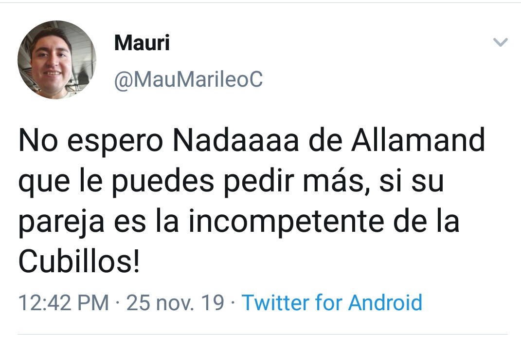 A través de sus redes sociales Natalia Valdebenito constantemente denuncia amenazas e insultos que recibe. Sin embargo, ninguno de estos mensajes logró el impacto que causó el de este domingo, donde incluso aparecieron políticos de derecha. El diputado Antonio Coloma y la ex ministra de educación, Marcela Cubillos, salieron en defensa de @MauMarileoC, pese a las diferencias de opinión.