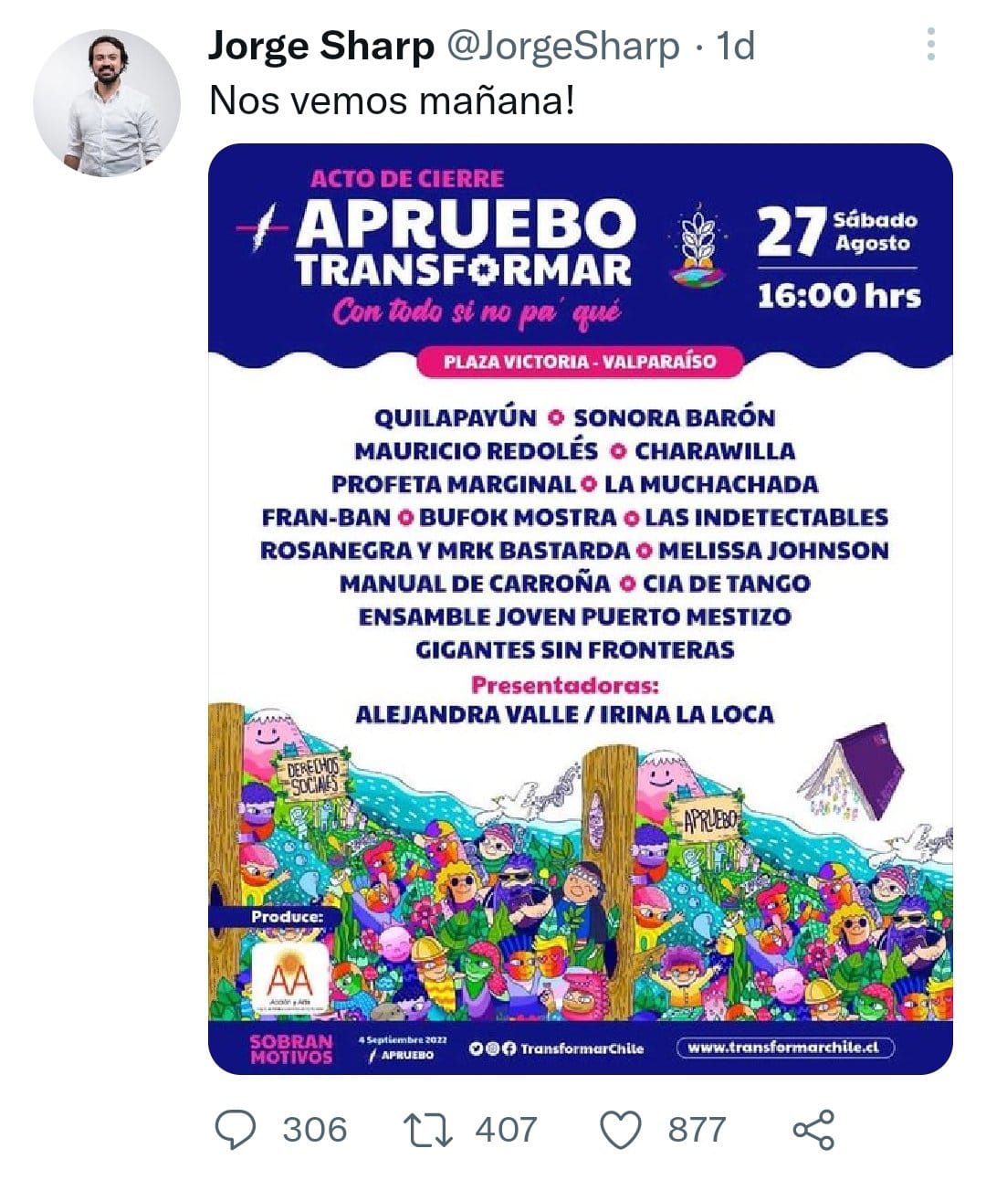 Quiero expresar mi absoluta condena a lo sucedido hoy en Valparaíso. No representa en ningún caso el sentido del acto que convocó a + de 3 mil personas, tampoco a Apruebo Transformar - como dice aquí 👇🏻 - ni menos al Apruebo. La acción en cuestión no estuvo en conocimiento previo https://t.co/O3NF0W5fZj