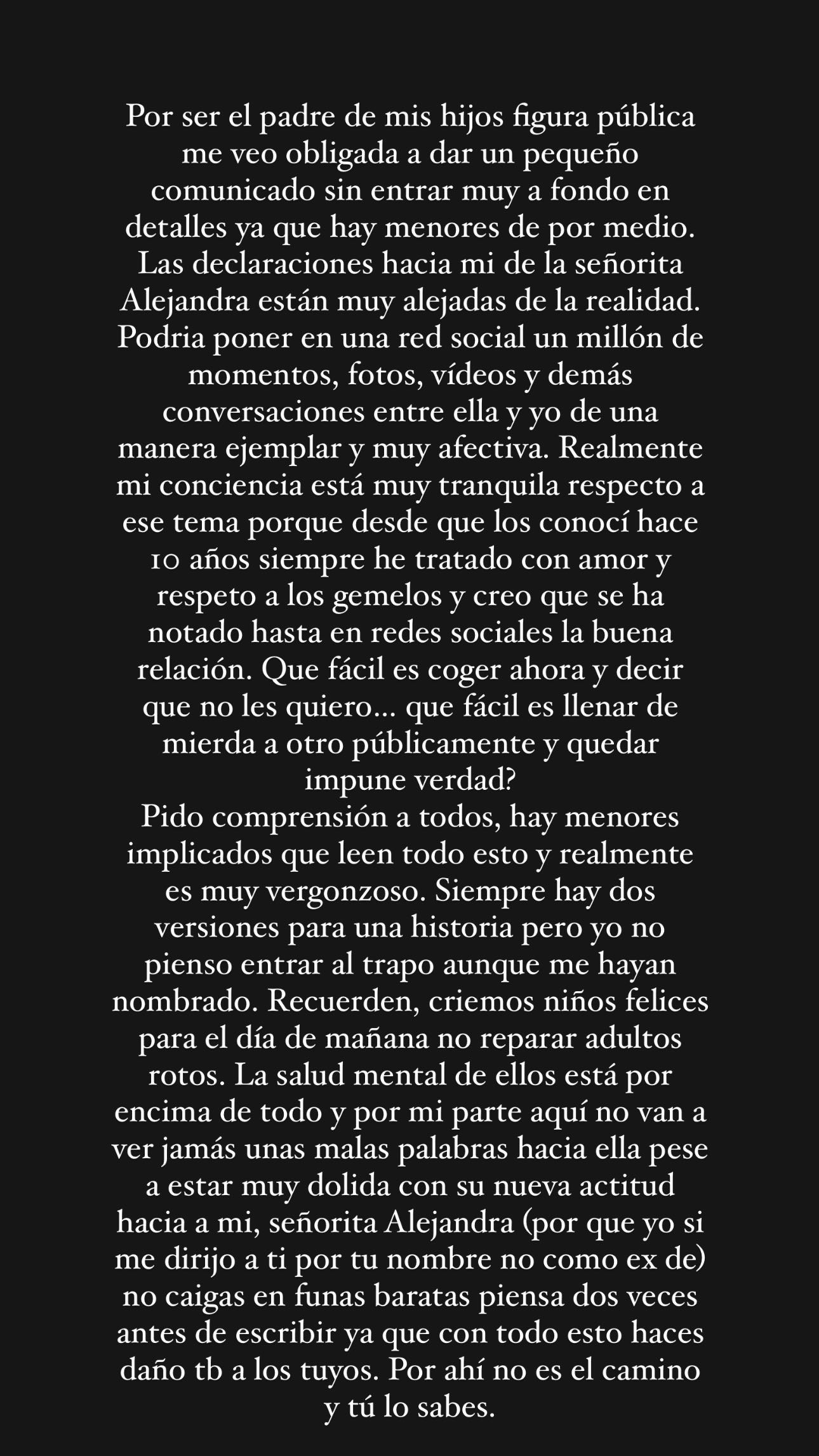 "La salud mental de ellos está por encima de todo y por mi parte aquí no van a ver jamás unas malas palabras hacia ella pese a estar muy dolida con su nueva actitud hacia a mi, señorita Alejandra (por que yo si me dirijo a ti por tu nombre no como ex de) no caigas en funas baratas piensa dos veces antes de escribir ya que con todo esto haces daño tb a los tuyos. Por ahí no es el camino y tú lo sabes", finalizó.
