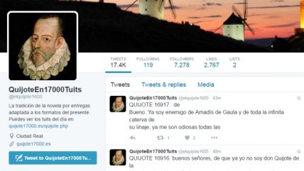 El Quijote en 17.000 tuits, el sueño cumplido de un... 19/04/2016 Diego Buendía escribió más de dos millones de caracteres de "El Quijote". Lo hizo para conmemorar el cuarto centenario del fallecimiento de Miguel de Cervantes.
