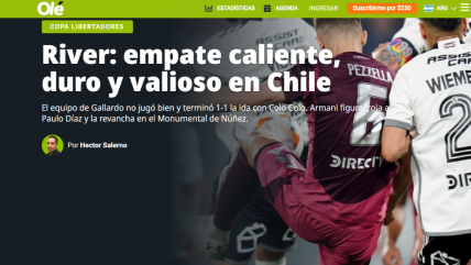 Copa Libertadores "Empate caliente, duro y valioso": La reacción de la prensa argentina por la ida entre Colo Colo y River