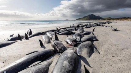 Un grupo ecologista neozelandés informó este sábado de la muerte de 215 ballenas piloto al quedar varadas en una...