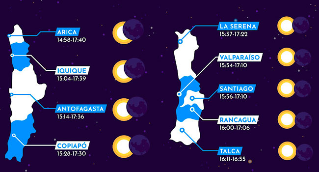 - Talca: Entre las 16:11 y las 16:55; el máximo ocurrirá a las 16:33, con 0,7% de visibilidad.