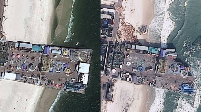 La secuencia muestra una comparación de imágenes; 7 de septiembre de 2010 (izquierda) y el 31 de octubre de 2012 (derecha), donde se pueden observar los daños causados por el huracán Sandy en el Casino Pier y el Parque de atracciones de Seaside Heights, en Nueva Jersey.