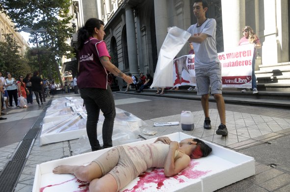 La organización Animal Libre realizó una llamativa intervención en el Paseo Ahumada de Santiago, entre Huérfanos y Agustinas, instalando seis bandejas gigantes de "Carne Humana", actividad que busca promover la vida vegana.