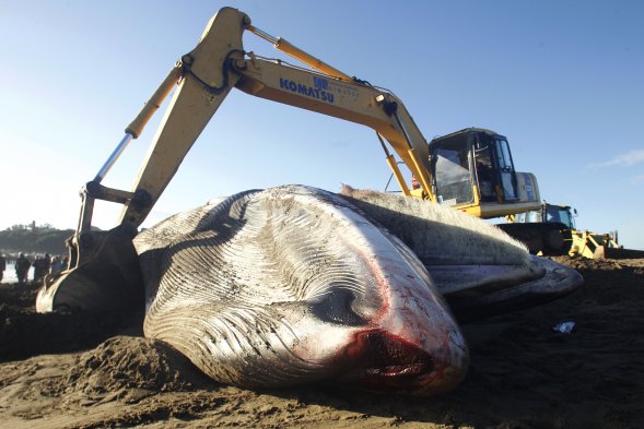 Una ballena muerta varó en la bahía de Lota este martes. El cetáceo, de un largo de 14,5 metros y de 10 toneladas de peso, fue llevado hasta la orilla y posteriormente fue enterrado en la playa por personal de la Armada.