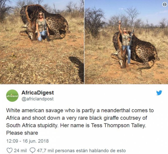 "Una blanca americana salvaje, medio neandertal, viene a África y mata una jirafa negra muy rara, cortesía de la estupidez de Sudáfrica. Su nombre es Tess Thompson Talley. Por favor comparte", escribieron en un tuit que se viralizó.