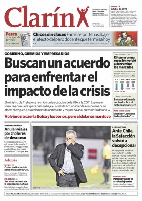 El diario argentino Clarín lanzó el sitio tapas.clarin.com, en que revisa sus portadas desde el 28 de agosto de 1945. Acá, algunas que consignaron a Chile como protagonista: 16 de octubre de 2008 y el triunfo de la selección chilena por la cuenta mínima ante Argentina.