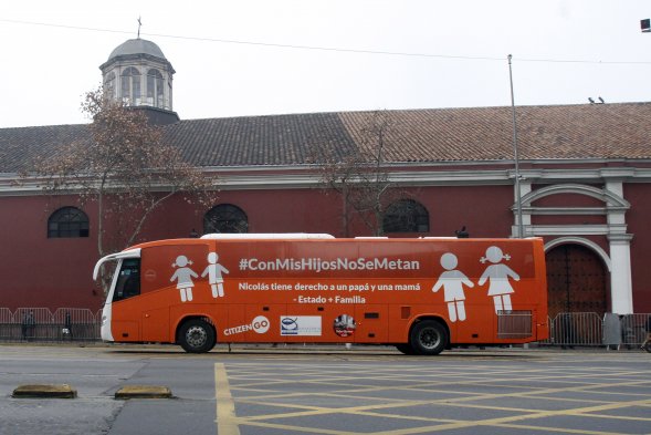 El "Bus de la Libertad", del grupo Citizen Go, y el "Bus de la Ideología", promovido por el Movilh, recorrieron la mañana de este lunes las calles del centro de Santiago, entre consignas de adherentes y detractores de uno y otro lado.