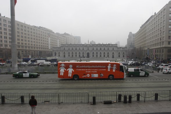 El "Bus de la Libertad", del grupo Citizen Go, y el "Bus de la Ideología", promovido por el Movilh, recorrieron la mañana de este lunes las calles del centro de Santiago, entre consignas de adherentes y detractores de uno y otro lado.