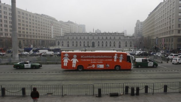 | El "bus de la libertad", que ha causado polémica en varios de los países a los que ha llevado su mensaje contra la educación sobre diversidad sexual en colegios, inició este lunes su recorrido por las calles de Santiago. (Foto: ATON)
