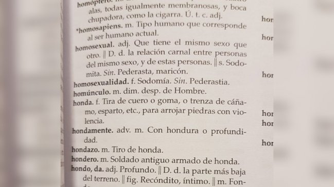Mediante una publicación en Facebook, evidenciaron que el Diccionario de la Lengua Castellana, de la Editorial Universitaria, define con fuertes descalificaciones la palabra "homosexual": "Sodomita. Pederasta, maricón", dice la tercera acepción, según el material.