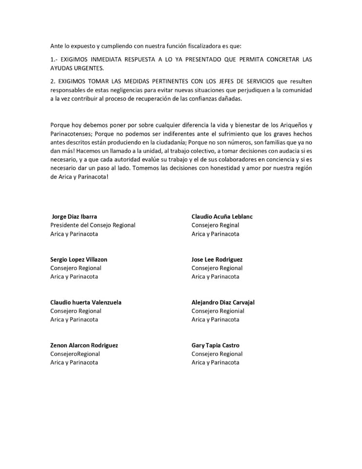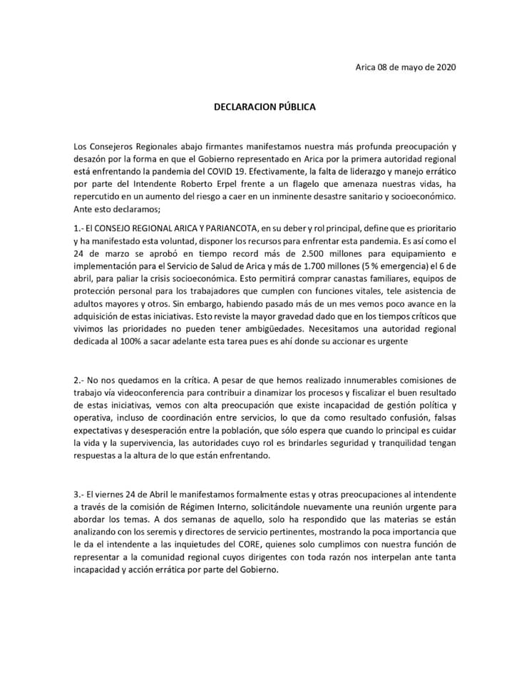 Las críticas se dan luego de la carta publicada (página 2) por 8 Consejeros Regionales de Oposición ante la demora de más de un mes en la compra de Canastas Familiares de Emergencia y Equipos de Protección Personal para los funcionarios del Servicio de Salud de Arica por $2.500 millones de pesos del FNDR.