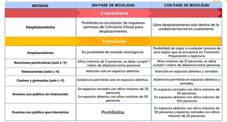 Se requiere permiso de Comisaría Virtual el fin de semana y festivos. El pase de movililidad permitirá el Libre en comunas en Paso 2 y superior. Posibilidad de viajar a cualquier comuna de otra región que se encuentre en Transición, Preparación o Apertura. Se deben acompañar del pasaporte sanitario.