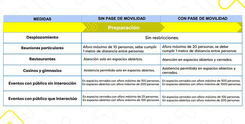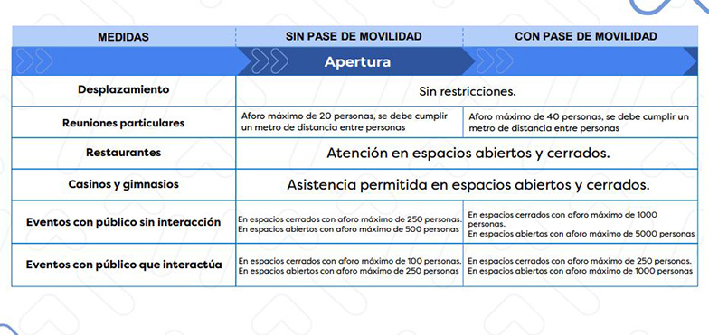 Además, los restaurantes, casinos y gimnasios podrán desarrollar actividades en espacios abiertos y cerrados, dependiendo del pase de movilidad de los asistentes.