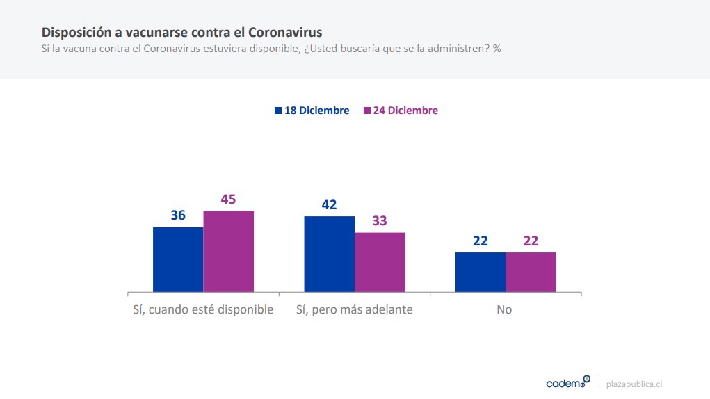 Un 45 por ciento de los consultados por Cadem declaró que se vacunaría contra el coronavirus en cuanto la fórmula esté disponible para ellos, nueve puntos más que en el resultado de la semana pasada de la misma encuesta.