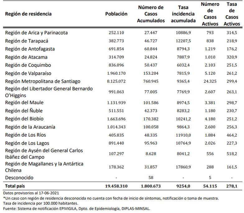 Según el informe, en Chile han ocurrido 1.800.673 casos de Covid-19 durante la pandemia, desagregados en 1.505.001 con confirmación de laboratorio y 295.672 probables, sin confirmación de laboratorio; acumulado que representa una tasa de 9.254 por 100.000 habitantes.