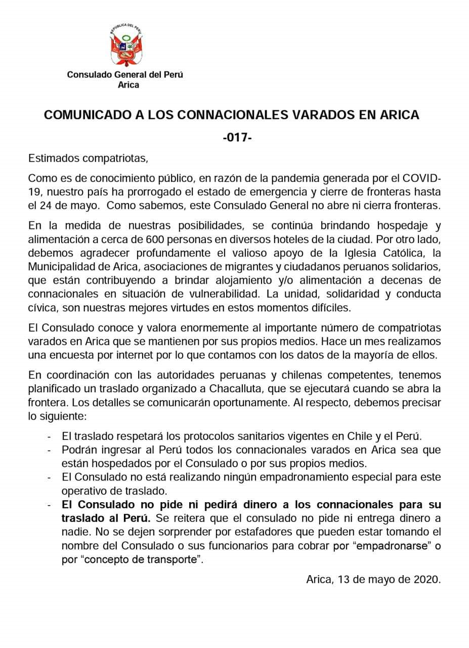 La información fue entregada a través de un comunicado por el consulado peruano en Arica.