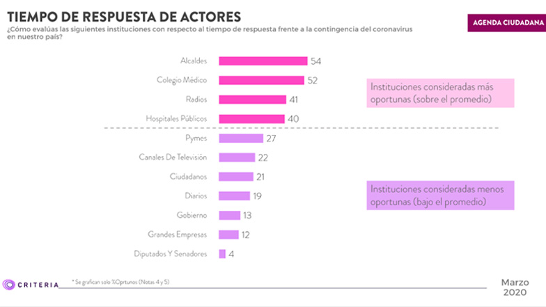 Criteria también consultó sobre la percepción ante el actuar de las instituciones: el 54 por ciento considera más oportunas las respuestas de los alcaldes; asimismo, el 52 por ciento evaluó igual a las del Colegio Médico, el 41 por ciento las de las radios y el 40 por ciento las de los hospitales públicos. Por el contrario, sólo el 13 percibe positivamente las acciones del Gobierno.
