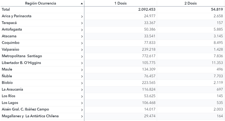 Detalle a nivel regional de personas vacunadas. (Fuente: DEIS)