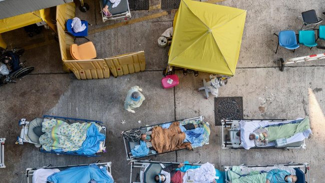 La misma escena se ha repetido en varios hospitales durante los últimos días ilustrando el colapso del sistema hospitalario de Hong Kong ante el peor rebrote de covid-19 sufrido en toda la pandemia y causado por la llegada de la variante ómicron.