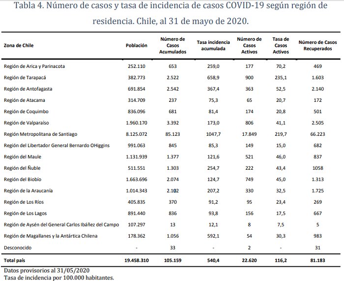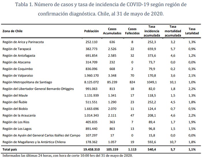 El documento, publicado este martes, entrega información detallada y actualizada hasta el domingo 31 de mayo de 2020 a las 10:00 horas, cuando Chile registraba 105 mil 159 casos confirmados, con una tasa de 540,4 por cada 100 mil habitantes.