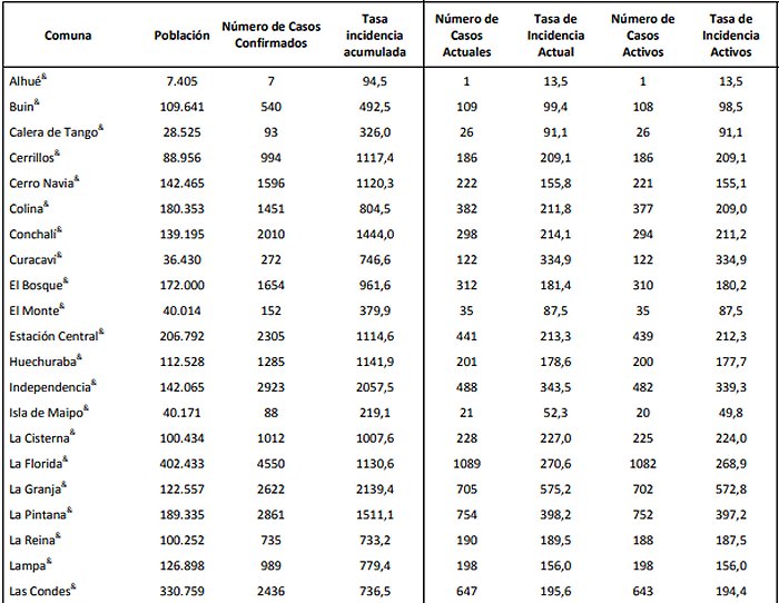 "Las mayores tasas de incidencia acumulada por 100.000 habitantes, según casos confirmados por laboratorio se encuentran en la Región Metropolitana (1049,1), Región de Tarapacá (659,9) y Región de Magallanes (592,6), todas con una tasa de incidencia acumulada por sobre la tasa nacional observada", señala el informe.