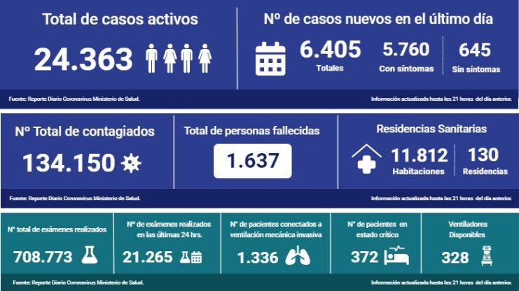 El Ministerio de Salud confirmó 6.405 casos nuevos de Covid-19 en las últimas 24 horas, lo que suma un total de 134 mil 150 contagios desde iniciada la pandemia en nuestro país.