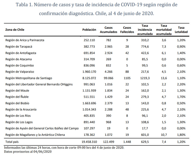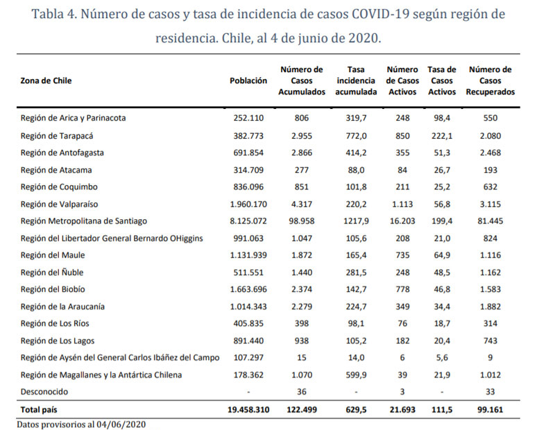 Según el documento, que contempla datos hasta el jueves 4 de junio, de los 4.317 casos totales que se han reportado en la región, 1.113 son considerados "activos" por la autoridad, es decir, que tienen aún capacidad de contagiar a otros.