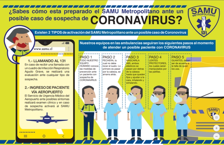 El SAMU Metropolitano dio a conocer el protocolo que aplicará para enfrentar los posibles casos de coronavirus que surjan en adelante, luego que este miércoles se ratificara un tercer caso de Covid-19 en el país, el primero en la Región Metropolitana.