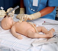 Los primeros minutos de vida fuera del útero materno son críticos para el correcto desarrollo del bebé. Para facilitar una buena actuación sanitaria frente a posibles complicaciones, la empresa Laerdal lanzó un muñeco interactivo, llamado "SimNewB", que simula a un recién nacido.
