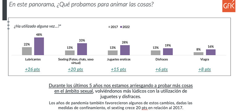 El uso de lubricantes pasó de un 22% de uso en 2017 a 48% en 2022; el sexting (fotos, chats y sexo virtual) creció de un 13% a un 33% en el mismo periodo; los juguetes eróticos aumentaron en su uso de un 13% a un 28% en cinco años; los disfraces pasaron de un 13% a un 19% y el uso de viagra de un 8% al 16%.