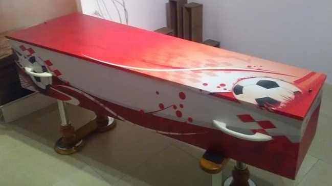 Se trata de un féretro blanco con la tapa pintada de rojo y un balón de fútbol en la parte inferior, así como otros detalles futbolísticos en los costados.