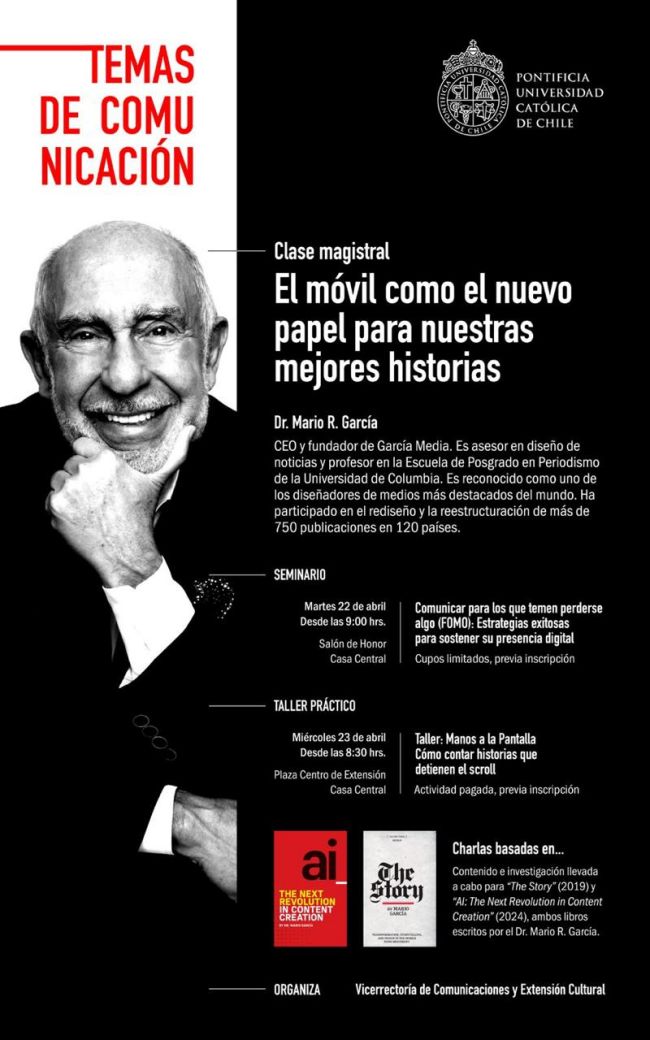 La Universidad Católica recibirá al destacado periodista y diseñador de medios Mario García, quien ofrecerá un seminario gratuito y además un taller práctico de storytelling, enfocado en la realidad digital que vive el mundo: la narración en los teléfonos.