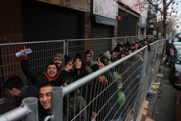 Al igual que los años anteriores, una larga fila de personas espera en el frontis del Teatro Caupolicán la venta de bodega de la tienda PC Factory donde se comercializarán unos 50 mil productos con hasta un 80 por ciento de descuento.