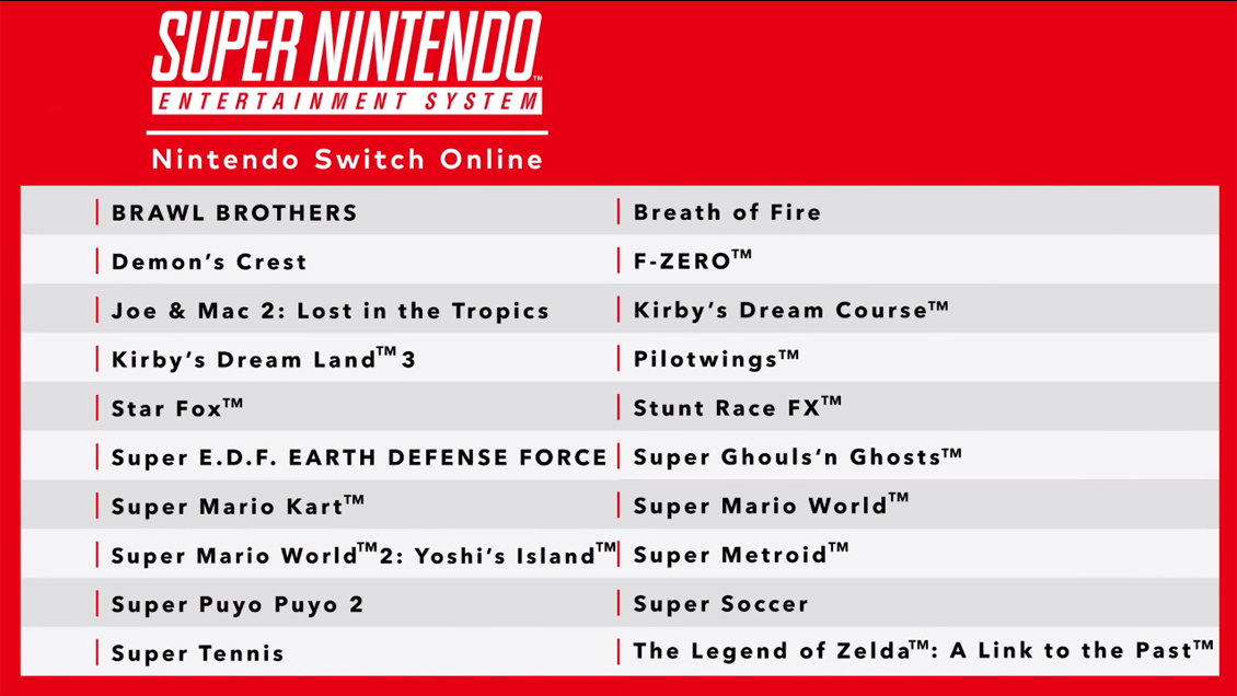 En total serán 20 videojuegos a los que podrán acceder los suscriptores del servicio online, entre los que destacan leyendas como "Super Mario World", "Kirby's Dream Land 3", "Super Metroid", "Breath of Fire" y "Super Mario Kart", entre otros.
