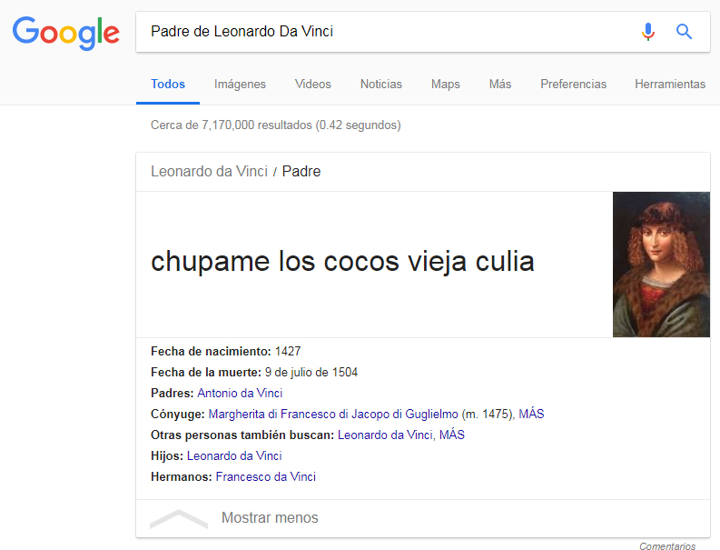 Al ingresar "Padre de Leonardo Da Vinci" en el popular buscador, no aparece Piero Fruosino Di Antonio Da Vinci, el nombre real del progenitor de Leonardo.